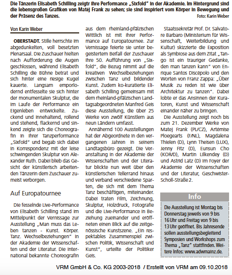 Ein weiterer Artikel des ‘blickpunkts’ zu der Ausstellung ‘Man muss das Leben tanzen: Kunst. Körper. Tanz. Wechselbeziehungen.’ in Mainz, RLP, welche noch bis Ende Januar in der Akademie der Wissenschaften und der Literatur zu sehen ist.