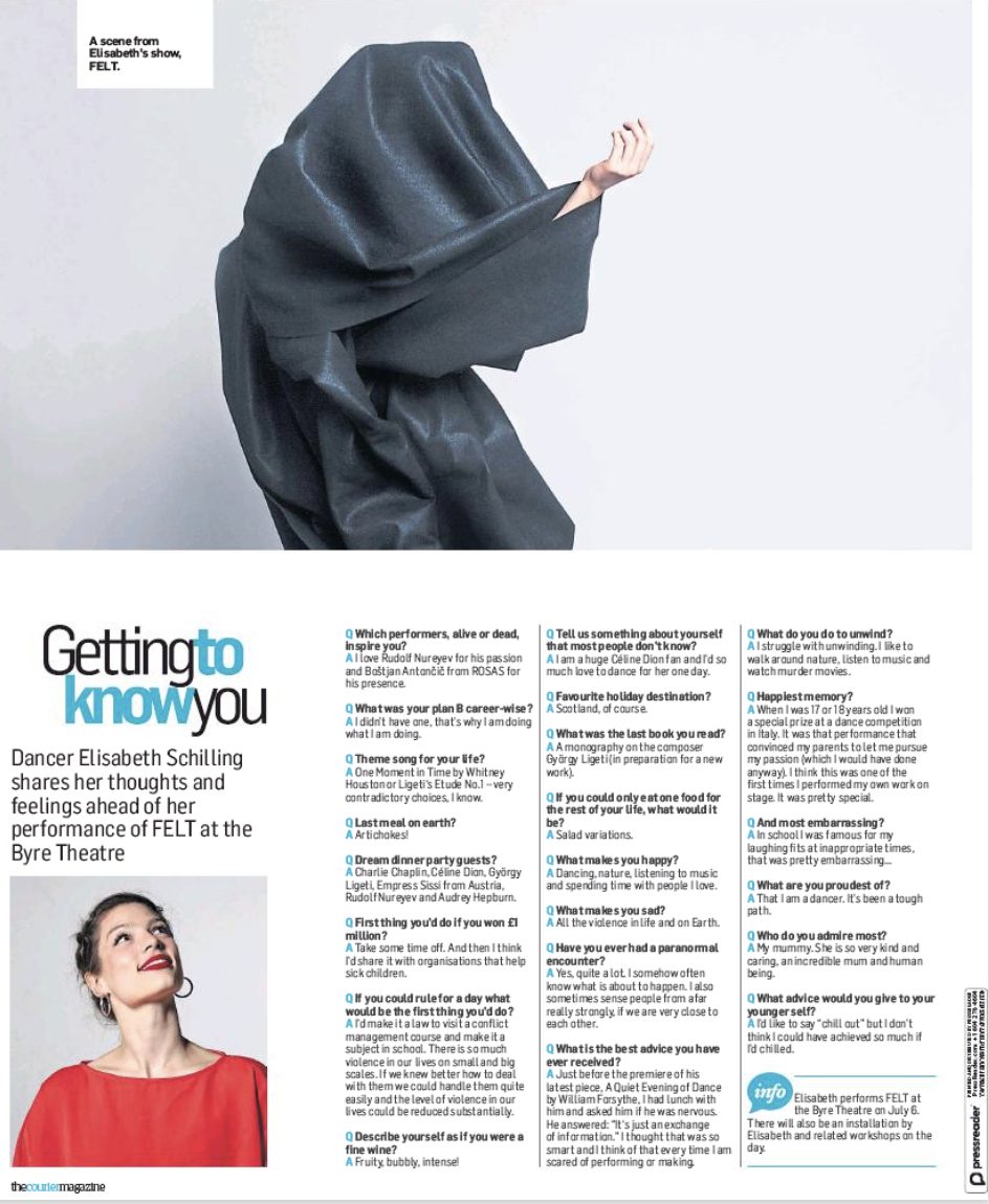 Zu den Aufführungen von FELT im Byre Theatre in St. Andrews gibt Elisabeth ein Interview in’The Courier’. Photos: Martine Pinnel / Bohumil Kostohryz