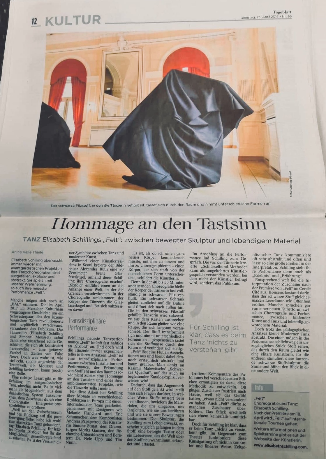 Die Kritik zu FELT von Anina Valle Thiele im Tageblatt Luxembourg. „Elisabeth Schilling überrascht immer wieder (…). Ihre Tanzchoreographien sind ausgefallen, explosiv und abstrakt. Sie spielen mit unserer Wahrnehmung.“ Manche (Publikumsteilnehmer) sprachen gar von einer neuen Kunstform, zwischen Choreographie und Performance, zwischen bildender Kunst und Tanz und lebendig gewordenem Material.“