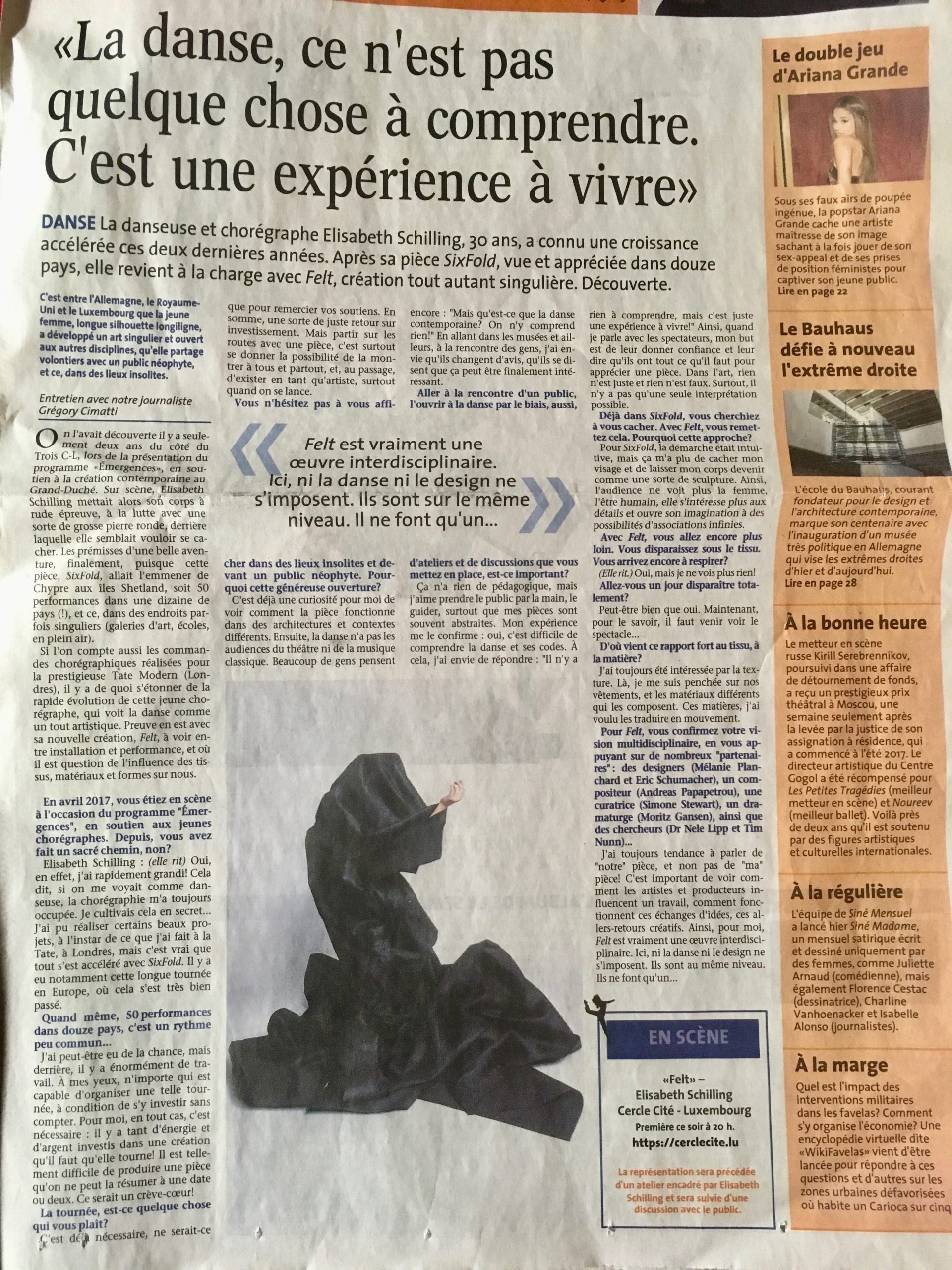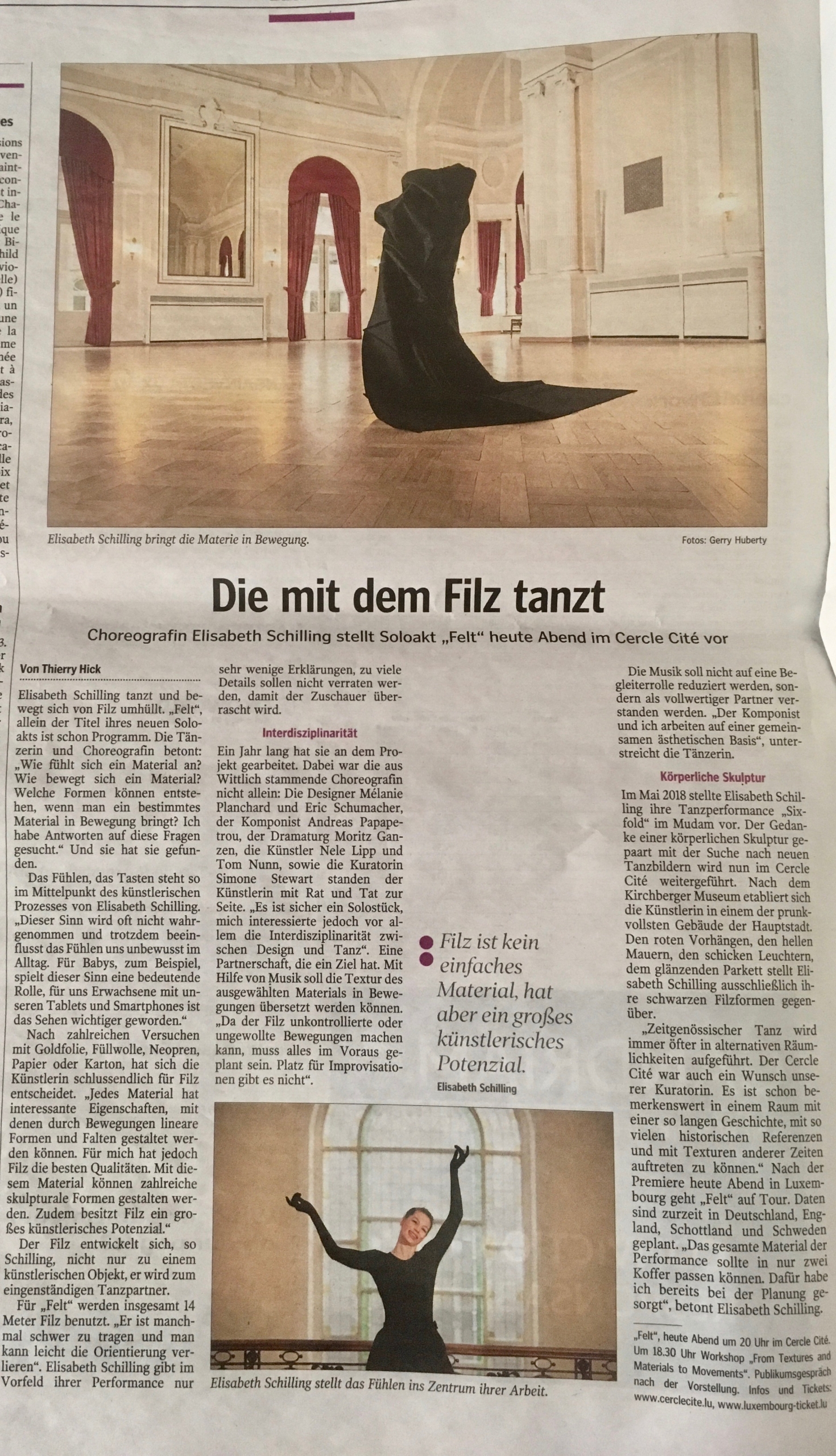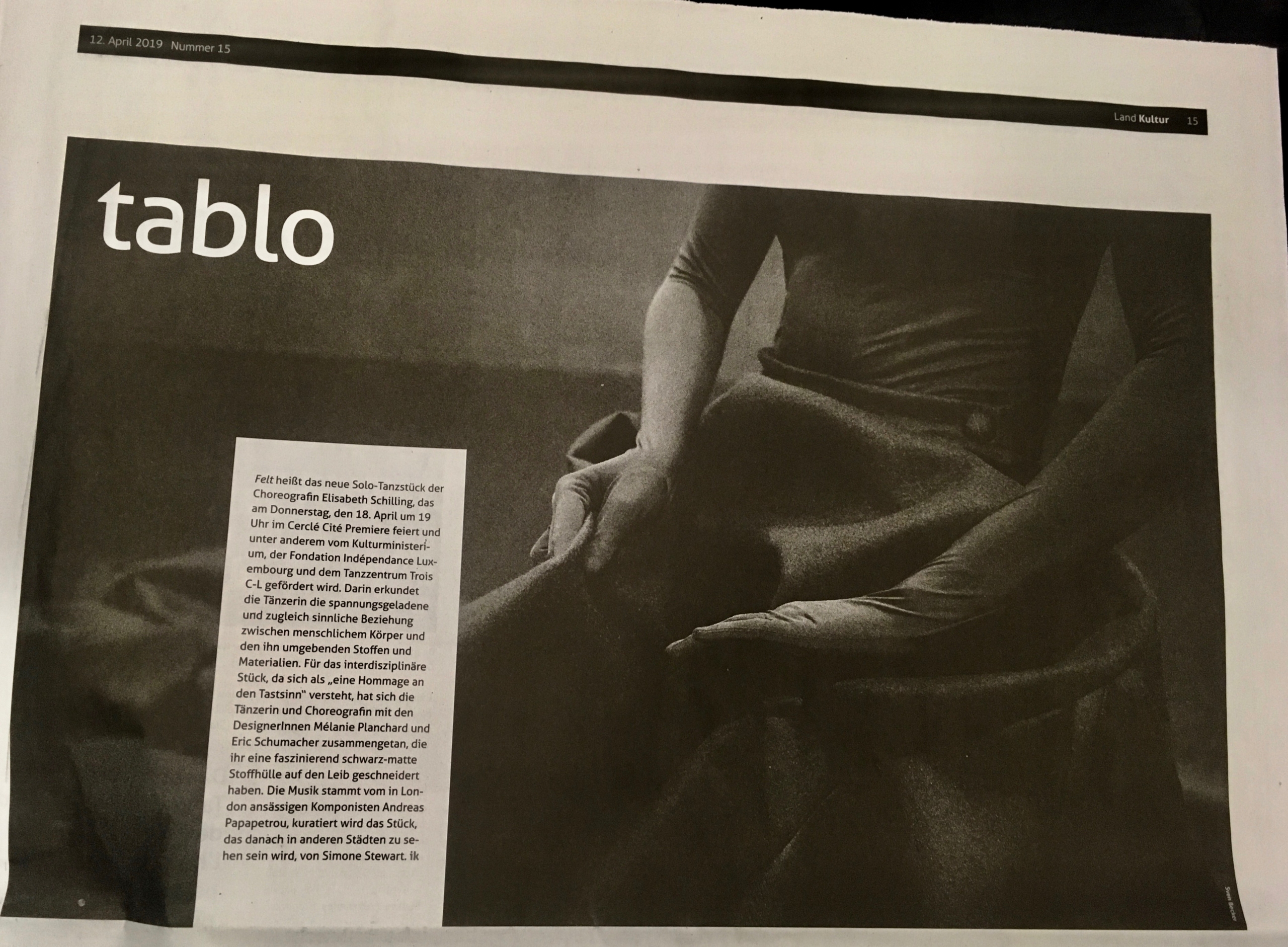 Zu der Premiere von FELT am 18. April 2019 im Cercle Cité Luxembourg schrieb das Luxembourger Wort folgenden Artikel zu dem Stück: