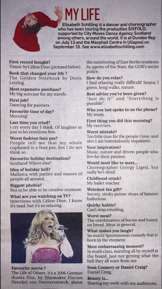 Elisabeth was interviewed by the Scottish Newspaper ‘Press & Journal’ regarding her current Scottish tour of SIXFOLD and her life as a dancer and choreographer. https://www.pressreader.com/uk/the-press-and-journal-inverness-highlands-and-islands/20180630/282527249177437