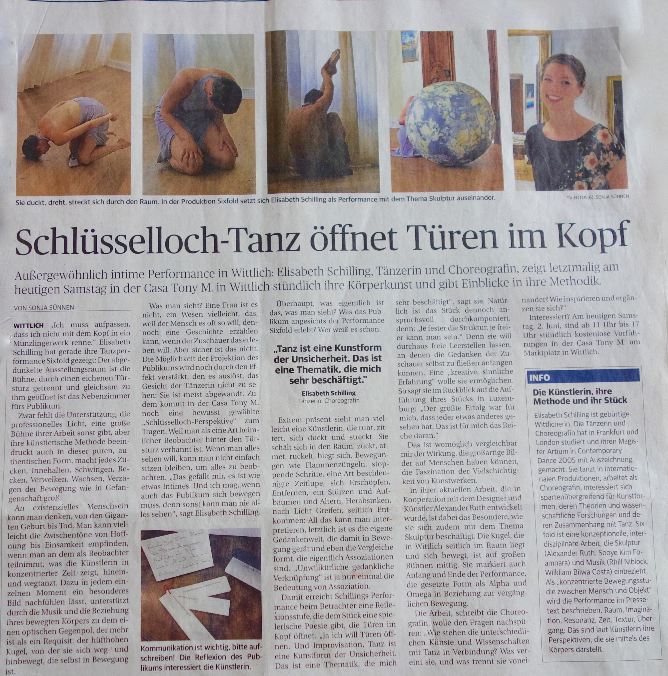 SIXFOLD has received a broad interest in Elisabeth’s hometown, Wittlich. The piece has been performed over 19 times; the children workshops were fully booked with a participation of 80 kids throughout the week. It was a special week with extraordinary impressions, interesting people taking place in a specific place that Elisabeth will surely keep […]