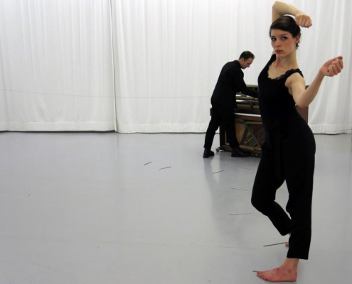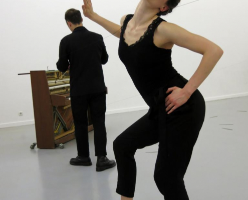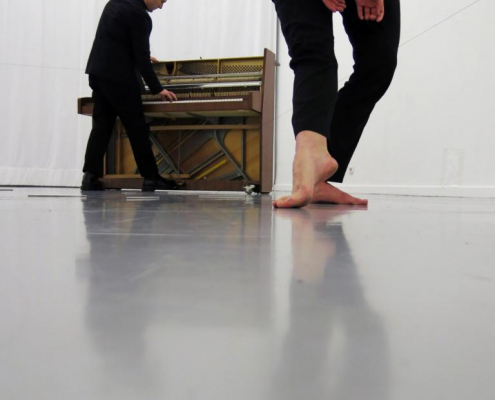 duo–through piano explores the correlation between: movement – sound, action – response/counter action, silence – stillness, composition – improvisation.The piano is the point where separate actions, physically and sonically; conjoin, phase, oscillate, and/or collide.