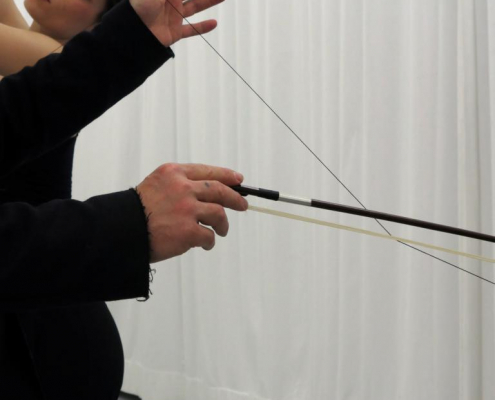 duo-through piano is a score for one dancer and one musician; using a piano (prepared as a string instrument, with four metal wires strung horizontally above the piano’s sound board), two fishing reels and lines, six metal chopsticks, and one violin bow. The fishing lines run from the reels, through the horizontal wires, to the dancer’s hands. Each movement made by the dancer makes a click from the reel, a rubbing drone from the wire, and; through vibration, produces a tone from the string connected below. These sounds are manipulated by the musician, standing at the piano, using the sustain pedal, preparations of metal chopsticks inside the piano, and bowing of the horizontal wires. The duo remains focused on the score, while, making compositional, aesthetic, and practical decisions.